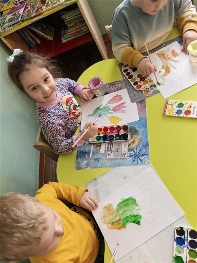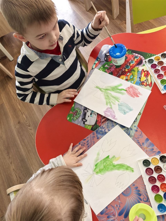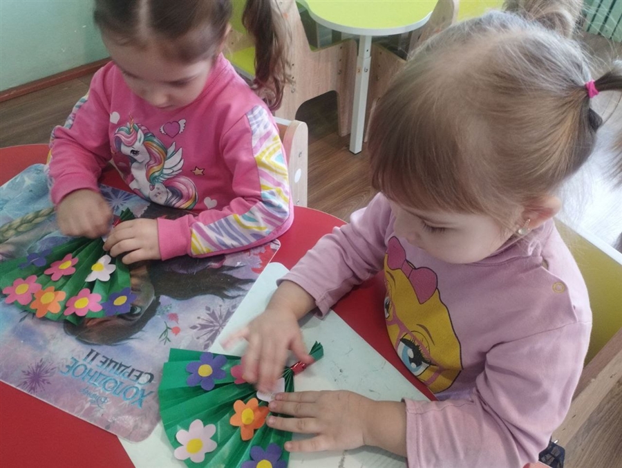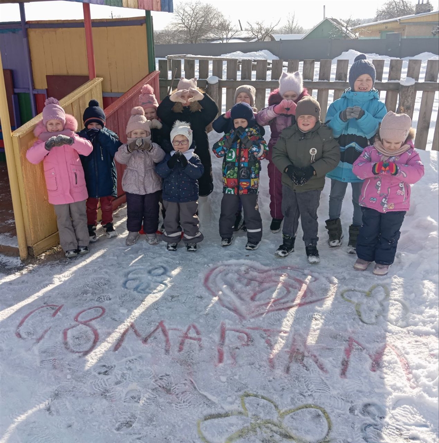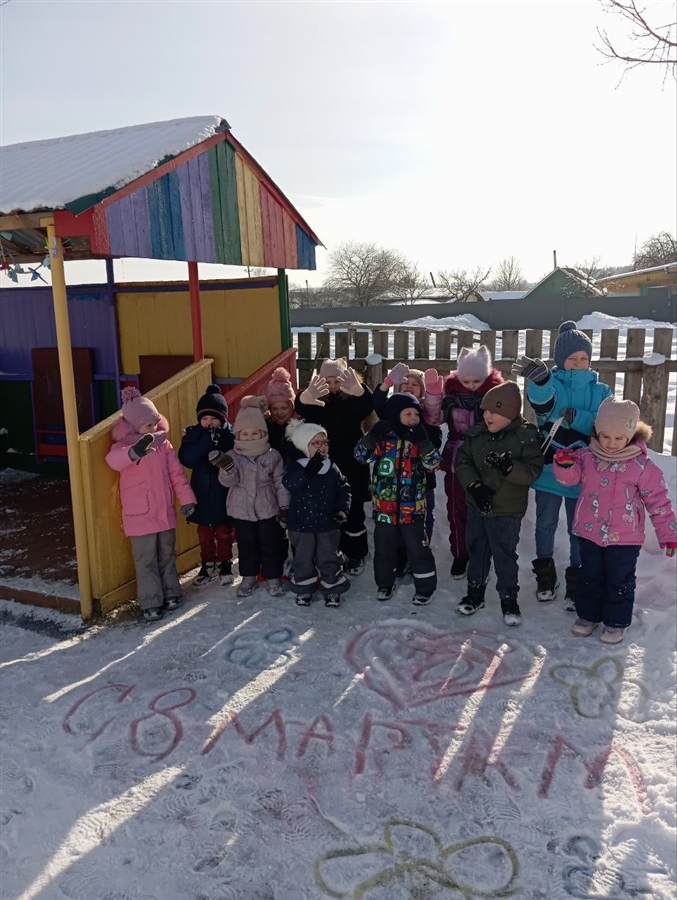 На занятиях ребята изготавливали красивые поздравительные открытки мамам и бабушками! На прогулках проводились веселые игры и ребята раскрасили волшебными мелками на участке снежные маленькие постройки.